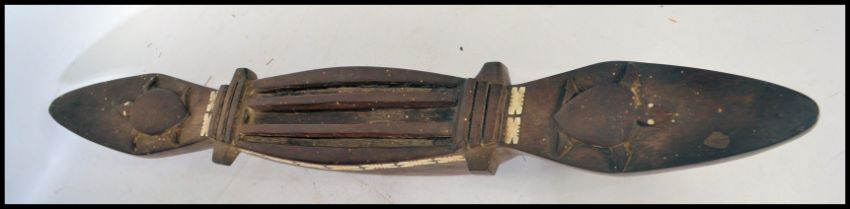 A 20th century unusual tribal carved bowl / musical instrument / game, having a single carved pedestal base supporting an carved top with turtle carved detail. PLease refer to images.  measures 8cm high x 67cm wide x 9cm deep.