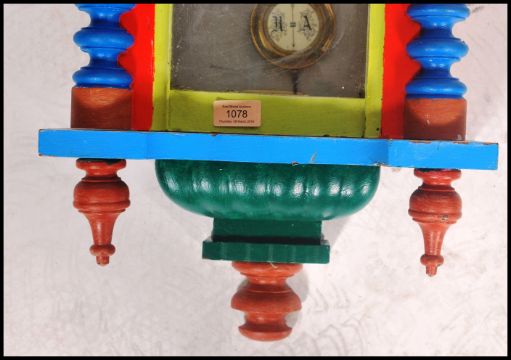 An early 20th century up-cycled wall clock in the manner of Gustav and Becker, the mahogany case being painted in a variety of bright colours. Measures 78cm tall.