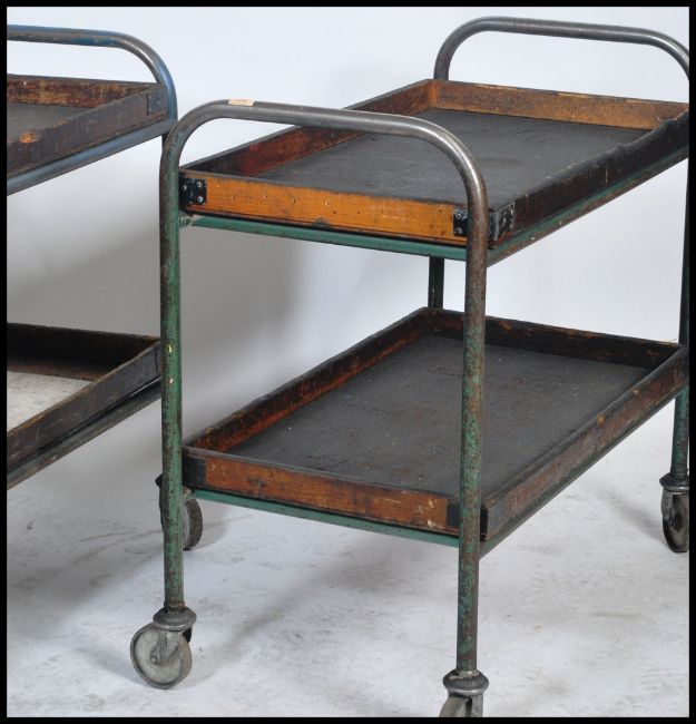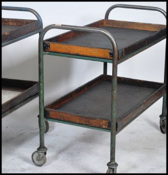 An excellent pair of mid century Industrial tubular metal engineers work trolley's. Each trolley with heavy tubular construction having wooden trays with gallery edges. One slightly larger, both on caster wheels. Measures 91cm x 100cm x 52cm.