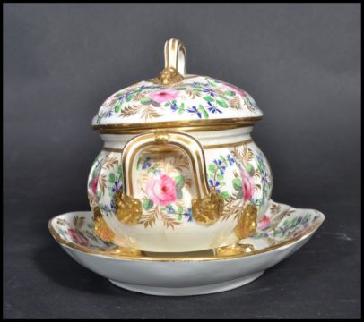 An early 19th century Derby Osmaton factory tureen and cover with stand. Highly detailed with floral sprays with gilt details and ormolu lion masks. Painted marks to base. Measures 14 cm high.