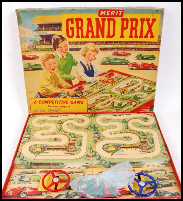 A charming vintage Merit made ' Grand Prix ' ' A Competitive Game! ' racing board game. Appears complete (but is unchecked) within a very good original box.