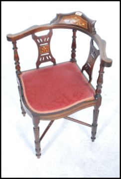 A 20th century Edwardian mahogany inlaid corner chair with upholstered pad seat and cruciform support  with ring turned legs, marquetry details to the back rest. Measures 73cm x 61cm x 59cm.