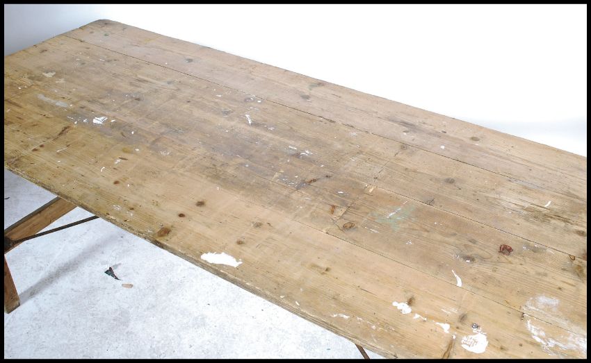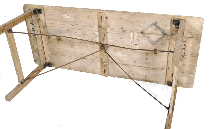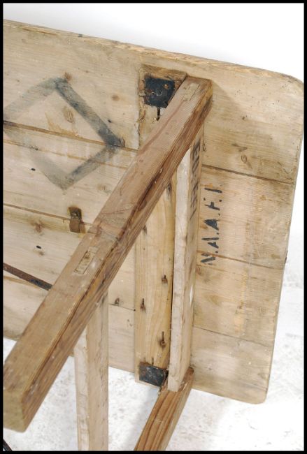 A vintage mid 20th century NAAFI dispersal folding table, plank top with square legs supported with hairpin stretchers, stamped to the underside.