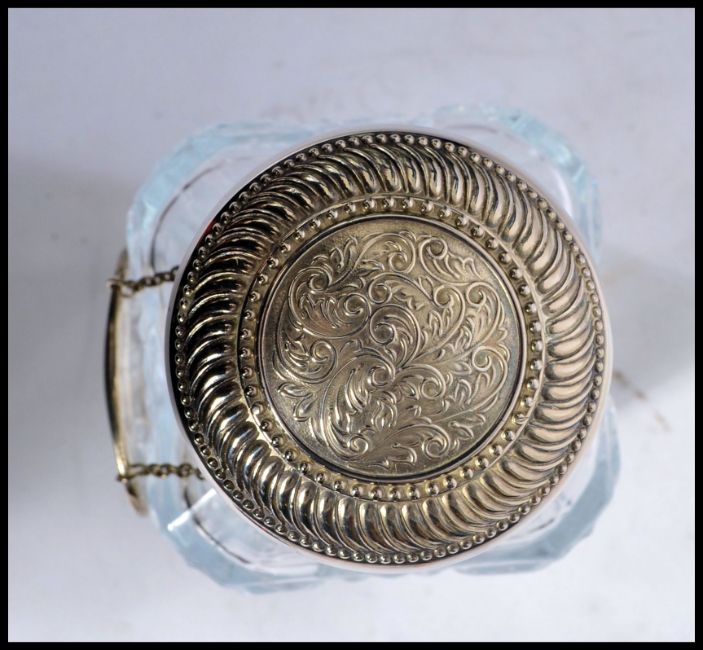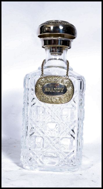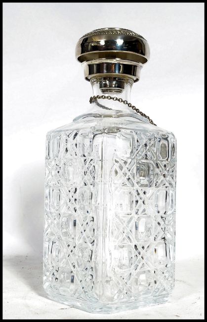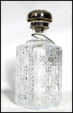 A boxed cased set of cut glass lead crystal wine glasses together with a lead glass decanter with silver plated stopper and label. Measures 17.5 cm high.