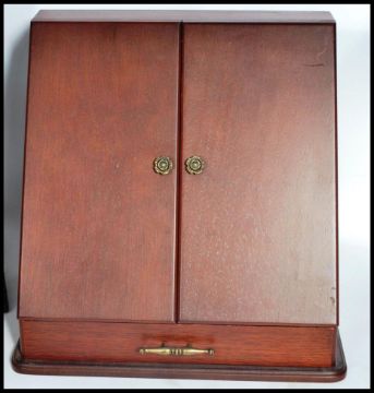 A good 19th century mahogany bathroom / toilet swing mirror raised on shaped leg supports with brass finial tops together with an easel mirror and metamorphic desk tidy. 43.5cm tallest, 45cm widest.