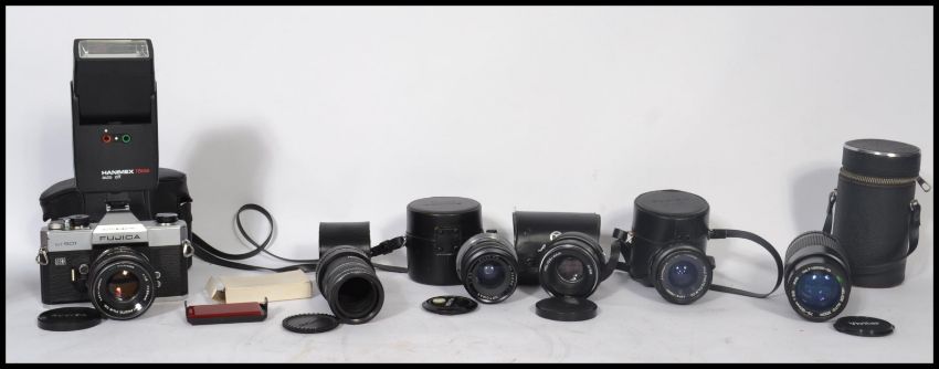 A vintage SLR Fujica ST901 Auto Electro camera with 55mm lens. Together with a 35mm Optomax lens in case, Fujinow lens 33mm, Helios -44m, Vivitar MC Tele Converter, Helios Auto Zoom 75 - 150mm lens in case. Along with others