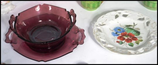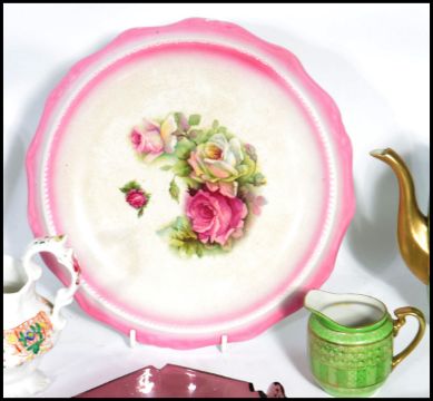 A collection of vintage ceramics to include 19th century ceramic ladles, cranberry glass dish and liner, jelly moulds, an Art Deco Japanese made coffee pot, creamer and lidded sugar bowl etc. Highest measures 22 cm.