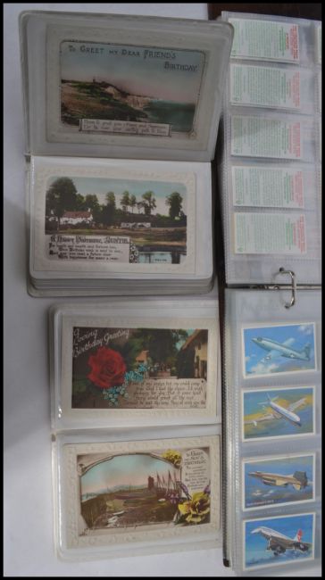 Ephemera; a collection of assorted ephemera to include; 2x small postcard albums filled with vintage greetings cards, a cigarette card album filled with assorted trading cards and cigarette cards (to include; Tony Oliver German Orders & Decorations, Tony Oliver German Uniforms, Embassy, Grandee and others), and a large album of vintage Canadian stamps. Good assortment.