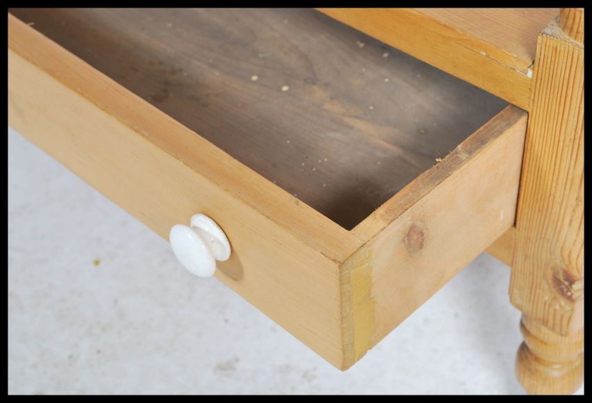 A Victorian pine country washstand being raised on turned legs having gallery top with washbowl recess over 2nd tier beneath. Measures: 99cm high x 69cm wide x 4cm deep.