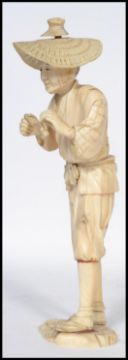 A 19th century Japanese Sectioned Ivory Okimono of a Merchant, Meiji period possibly of a musician playing a flute signed to base. Measures 21 cm high.
