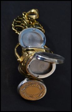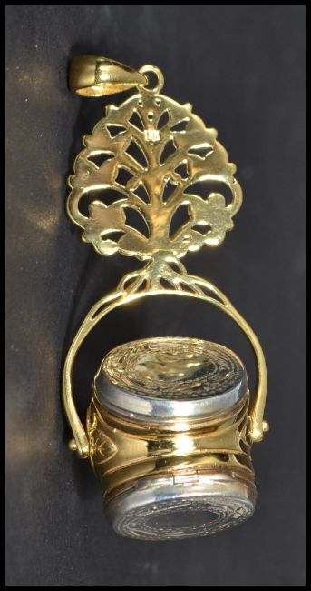 A sterling gilt silver locket in the form of a revolving fob with tree atop. Weighs 21 grams.