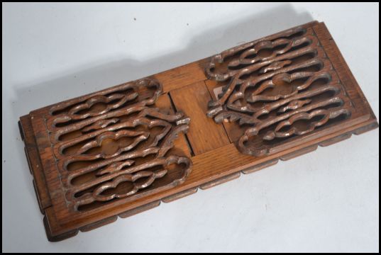 A 19th century mahogany ecclesiastical extending book stand trough on plinth  base with pierced arched end supports that fold in