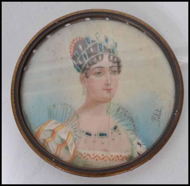 An early 19th century watercolour on ivory portrait miniature painting of Empress Eugenie. The portrait of circular form in a metal frame. Signed Petit. Measures 6.5 cm diameter.