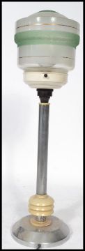 An early 20th century art deco table lamp having a column and bulbous gilt bottom on a terraced base with a spherical frosted glass shade and green banding.