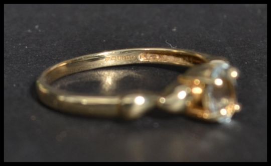A hallmarked 9ct gold ring having a central  white stone with twist shoulders. Weighs 1.8 grams size O. Complete in presentation box.