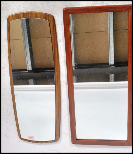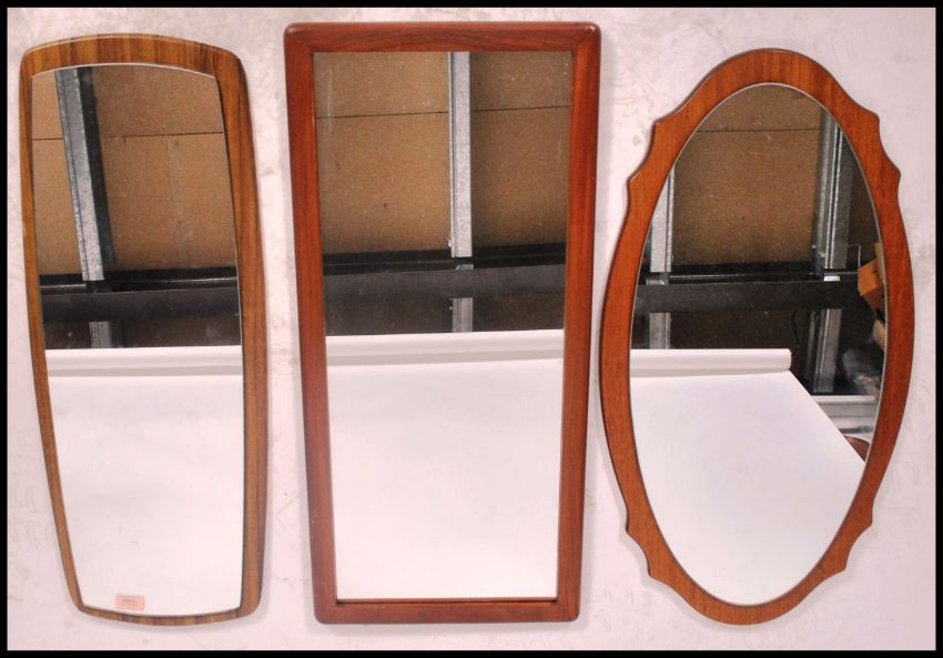 A group of three vintage 20th century retro teak mirrors. One being an frame less example. Measures 78cm tall.