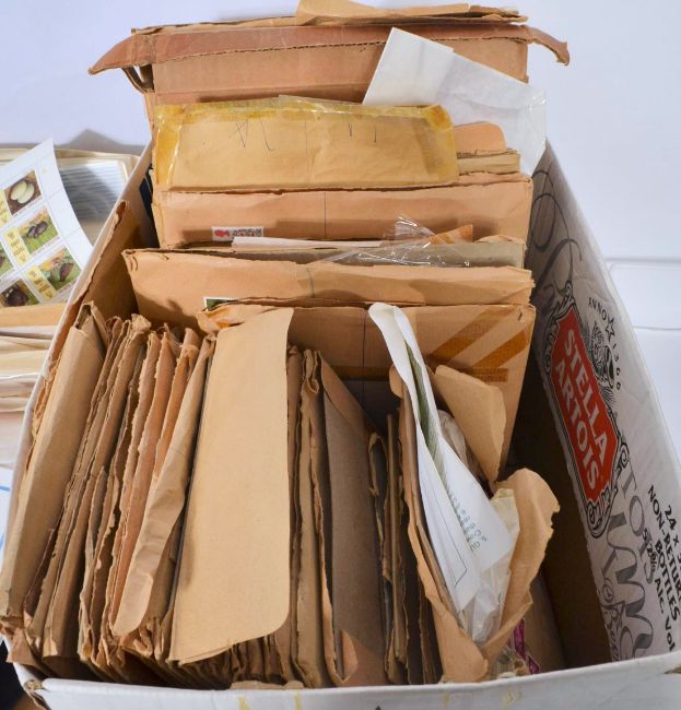 Stamps; a large collection (spanning three boxes) of assorted all world stamps within envelopes, along with a quantity of related ephemera to include; First Day Covers, magazines, postcards, commemorative sets, pamphlets and other philatelic material. Large assortment.