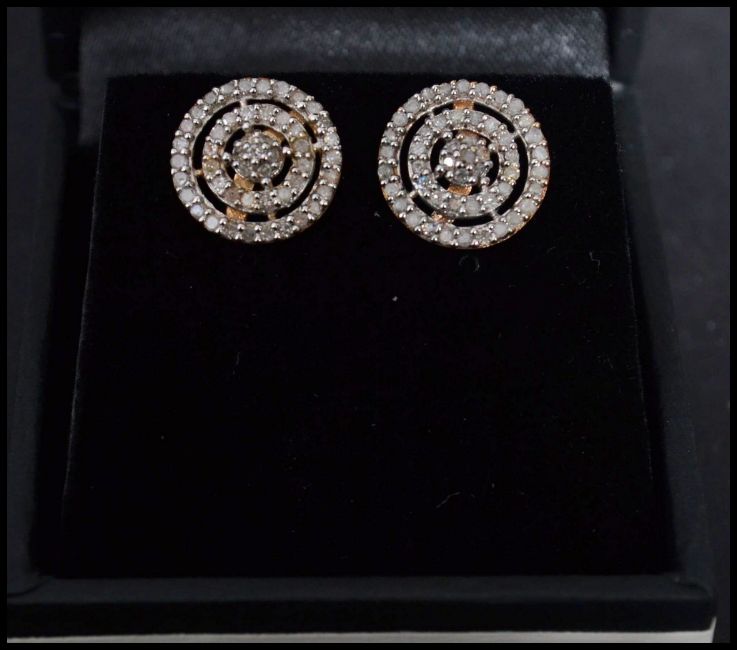 A pair of 9ct gold and diamond earring of layered roundel form complete in presentation box.
