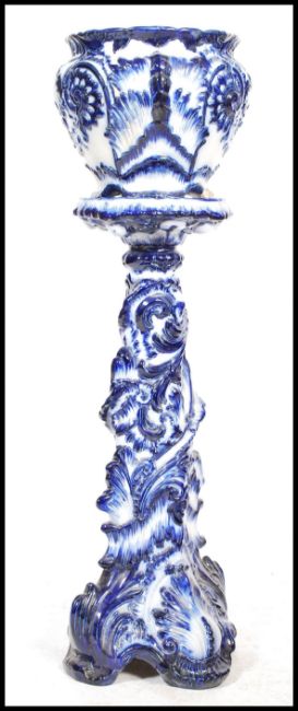 A 19th century Staffordshire ceramic blue and white foliate  jardiniere / pot stand, with blue and white dripware glaze in the Minton style. Measures 110cm tall.