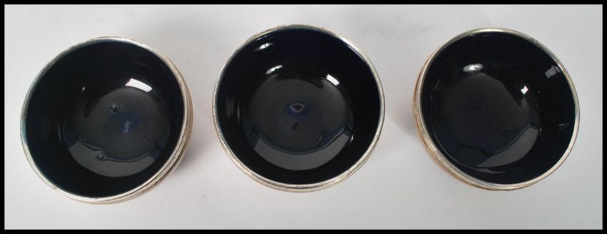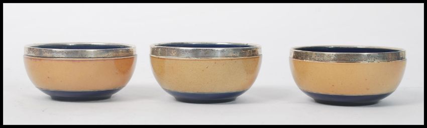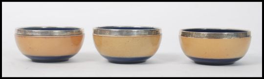 A group of four Royal Doulton bowls having silver hallmarked rims. One bearing inscription For Baby and two reading Guid Emal Maks Braw Bairns. Stamped to base. Measures 11cms wide. Note; from an extensive private collection of Royal Doulton. The vast majority of items are free from any damage or restoration, and are in great condition. Buyers are reminded for the need to satisfy themselves as to condition of individual lots prior to bidding as condition on some, will vary.