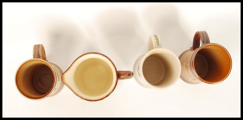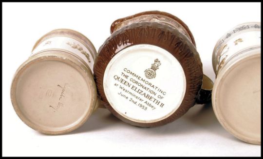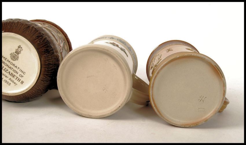 A group of three Doulton commemorative trial tankards for the 1953 Coronation by Agnete Hoy in differing colourways along with a Doulton commemorative jug. (4) Note; from an extensive private collection of Royal Doulton. The vast majority of items are free from any damage or restoration, and are in great condition. Buyers are reminded for the need to satisfy themselves as to condition of individual lots prior to bidding as condition on some, will vary.