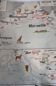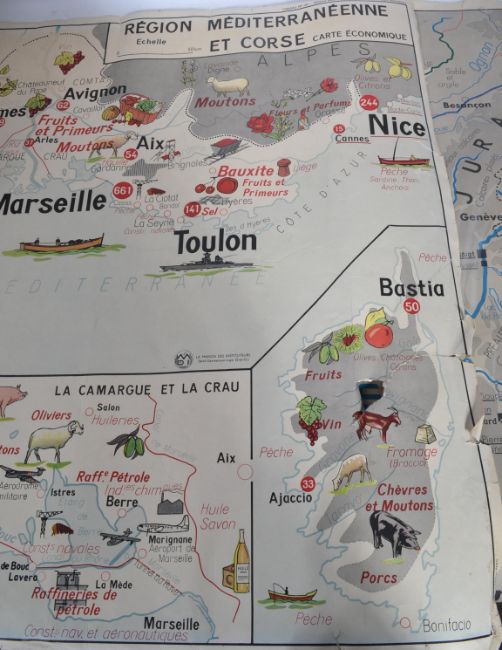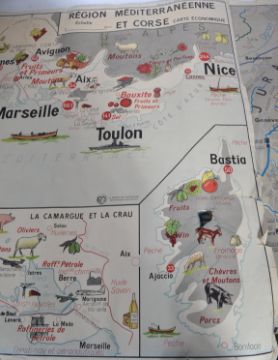 A vintage mid century French " Region Mediterraneenne et Corse Carte Economique " school poster together with another
