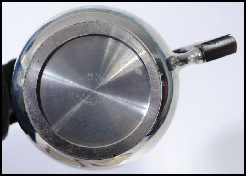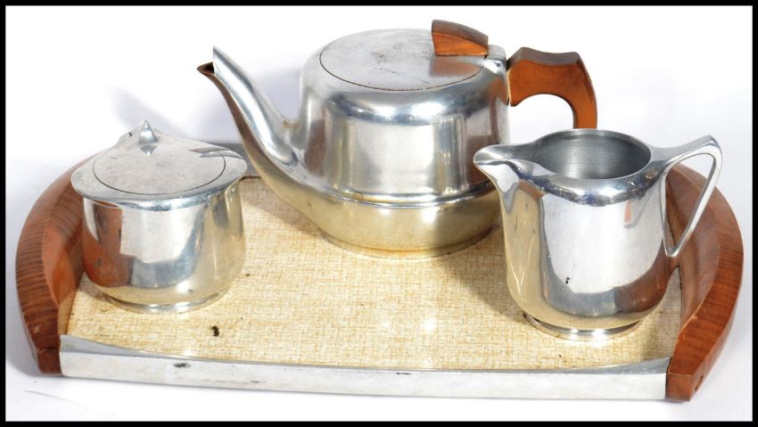 A vintage Picquot ware mid century stainless steel and teak wood service comprising 2 trays, coffee pot, teapot, sugar bowl and creamer
