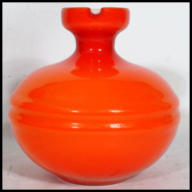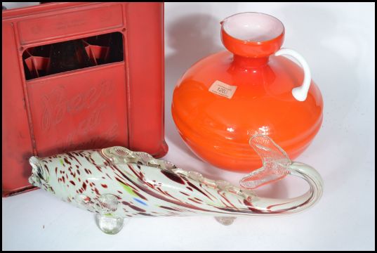 A retro mid century orange glass squat ewer jug vase together with a Murano glass fish and a red plastic vintage bottle crate housing 6 vintage Guinness bottles. Tallest 23cm