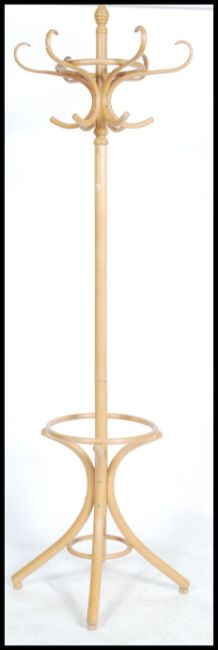 A vintage 20th century Thonet style bentwood hat stand being raised on splayed legs with s-shaped hooks atop. Measures 192cm tall.