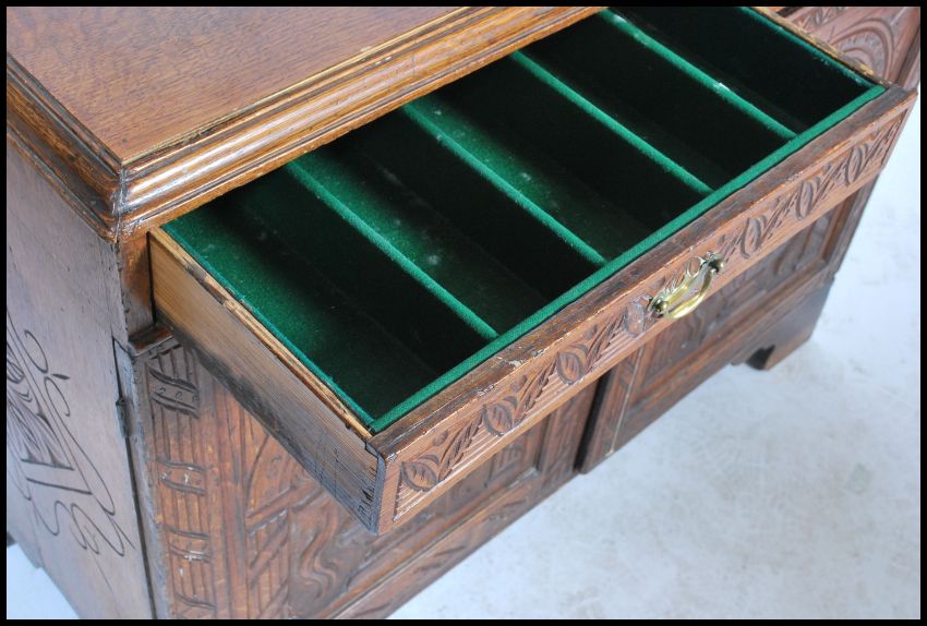A 19th century country oak cupboard two full length doors swag drop brass handles raised on bracket feet. The doors and sides carved with ornate detail, matching chest of drawers in Lot 1467. Measures 84cm x 106cm x 52cm.