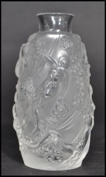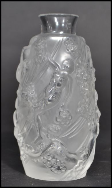A Lalique pressed glass miniature vase depicting nude maiden and flowers. Etched signed to base Lalique Paris. In original box. Measures 10.5cm.