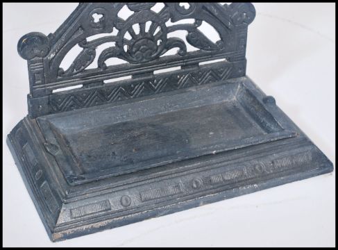 A Victorian cast iron aesthetic movement stick stand. Tray base with upright column back having pierced design. Rd no to verso, the stand in the manner of Carron, Falkirk, Scotland. Measures 68cm x 40cm.