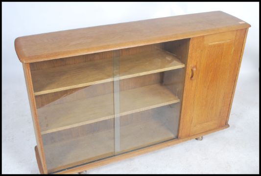 A mid century oak display cabinet bookcase room divider in the manner of Ercol, believed to be Priory. Raised on shaped base with castors having sliding glass door bookcase with cabinet to the side, flared top above. Measures 88cm x 136cm x 34cm.