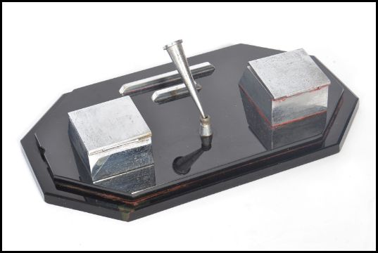 A vintage early 20th century Art Deco twin capstan inkwell desk tidy of black glass construction with chrome and ceramic inkwells and pen rest. Measures 31 cm wide.