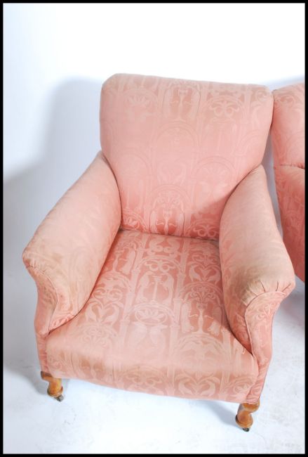 A pair of early 20th century country house Chesterfield / club armchairs being raised on walnut stub cabriole legs with deep framed armchairs having barrel arms and shaped back rests to each. Measures 90cm x 83cm x 90cm.