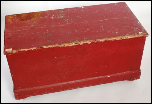 A large early 20th century pine blanket box having brass drop handles with a red painted finish. The hinged lid opening to reveal a spacious interior. Measures 48cm x 98cm x 48cm.