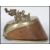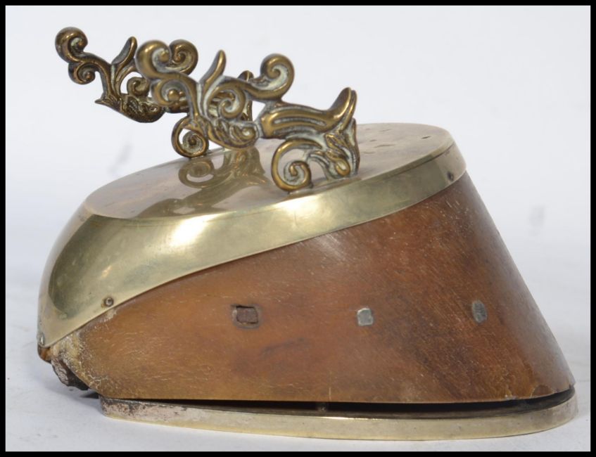 A 19th century Victorian desk top pen rest in the form of a taxidermy horse hoof having scrolled brass mounts. Reads Tempest October 1881, Measures 9 cm high.