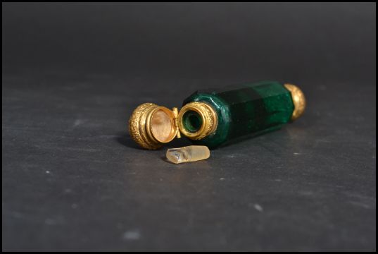 A 19th century Victorian faceted green glass double ended perfume bottle with hinged gilt metal mounts opening to reveal glass stoppers. Measures 12 cm long.