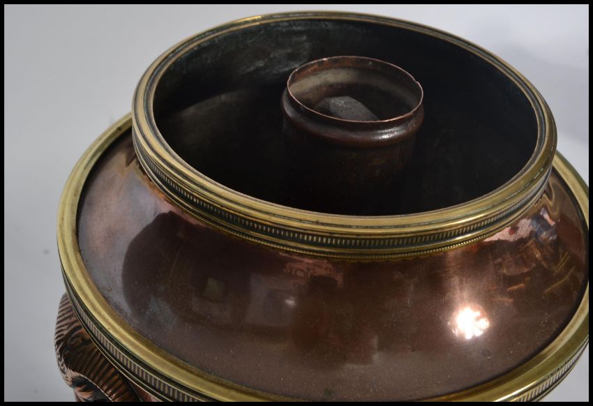 A late 18th century Georgian copper and brass samovar raised on a square base with ram head ring handles and finial top. Measures 37 cm high.