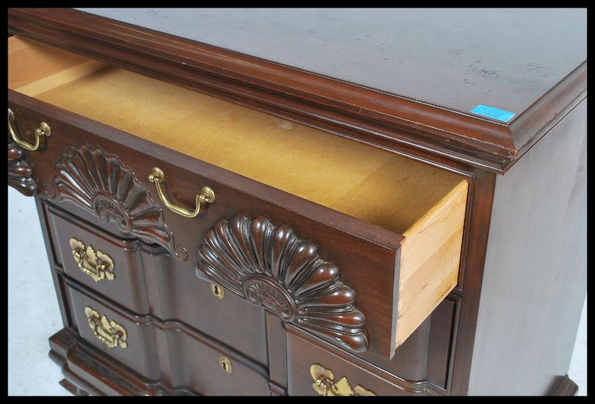 An American Federal style inverted breakfront stinkwood / stink wood chest of drawers by Harden furniture. The bank of drawers having carved shell decoration to the front. Measures 87cm x 92cm x 52cm.