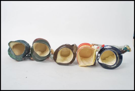 A group of five Royal Doulton character jugs to include The Red Queen D6777 , Rip Van Winkle D6438 , Robin Hood 1946 , Gulliver D6560 , and the Sleuth D6631. Measures 19cms high. Note; from an extensive private collection of Royal Doulton. The vast majority of items are free from any damage or restoration, and are in great condition. Buyers are reminded for the need to satisfy themselves as to condition of individual lots prior to bidding as condition on some, will vary.
