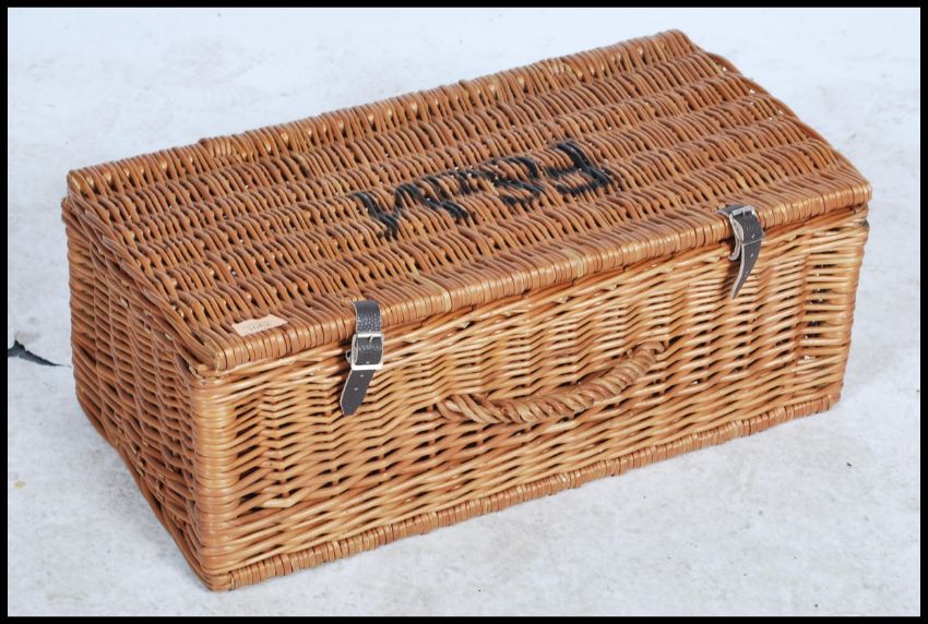 A vintage 20th century Fortnum and Mason wicker basket picnic hamper with stencilled lettering. Measures 24cm x 60cm x 31cm.