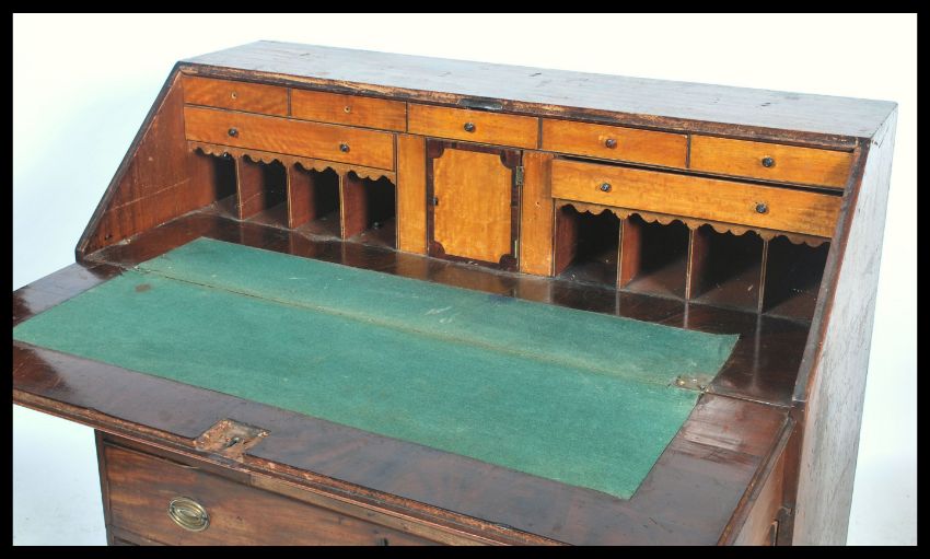 A Georgian 19th century country mahogany  large bureau desk. The oak bureau with a large chest of drawers under fall front bureau with appointed interior. Brass handles to the drawers. Measures 108cm x 117cm x 56cm.