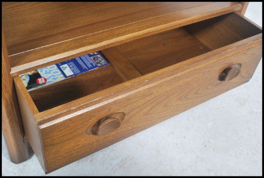 A 20th century Ercol ' Golden Dawn ' elm wood side table unit having a drop leaf table top with drawer to centre, all raised on squared legs. Measures 48cm x 72cm x 35cm.