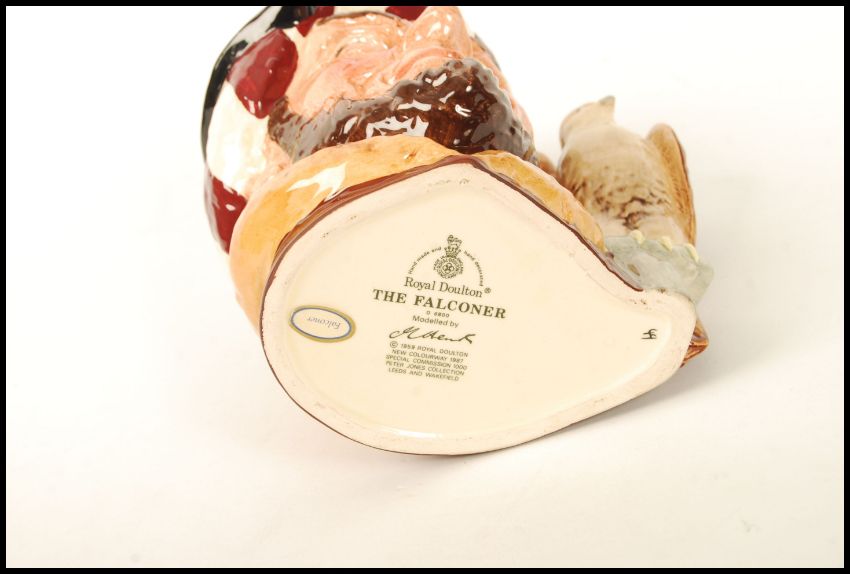 A Royal Doulton Large Character Jug The Falconer D6800, limited edition colour way for Peter Jones China 1987. Measures 19cms high. Note; from an extensive private collection of Royal Doulton. The vast majority of items are free from any damage or restoration, and are in great condition. Buyers are reminded for the need to satisfy themselves as to condition of individual lots prior to bidding as condition on some, will vary.