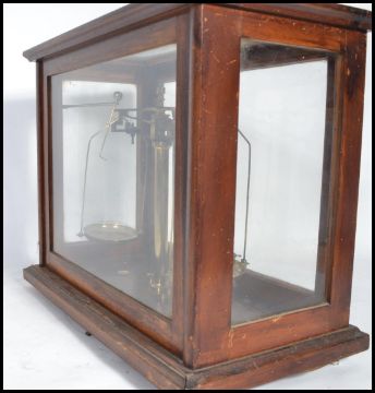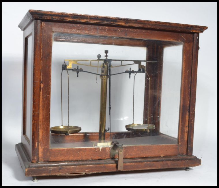 A cased set of early 20th century scientific scales with glass oak case having inset scales. Measures 36cm high.