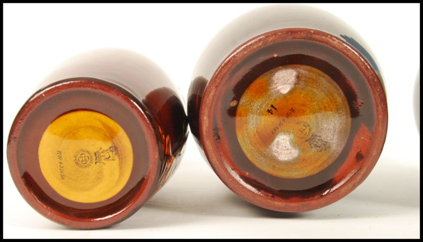 A good collection of Royal Doulton kingsware liqueur flasks to include the pied piper liquer flask having a hallmarked silver stopper, watchmen liqueur flask and a Mr pickwick scened jug together with an ashtray and trinket dish. Tallest measures 22.5cm. Note; from an extensive private collection of Royal Doulton. The vast majority of items are free from any damage or restoration, and are in great condition. Buyers are reminded for the need to satisfy themselves as to condition of individual lots prior to bidding as condition on some, will vary.