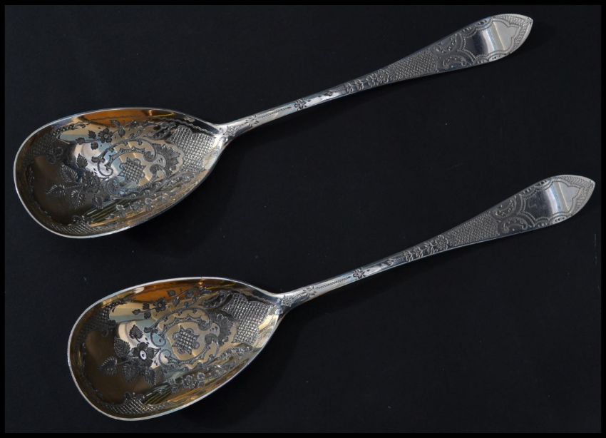 A pair of early 20th century Edwardian silver hallmarked gilt serving spoons having engraved bowls and handles. Hallmarked for Sheffield 1902 makers Atkin Brothers. Measures 22cm long.