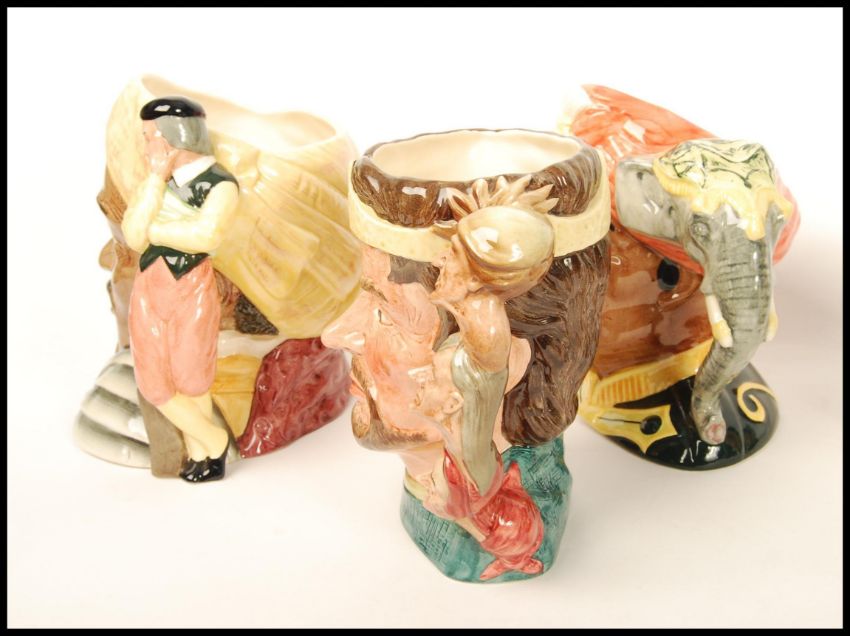 A group of six Royal Doulton character jugs to include The Witch D6893 , The Lumberjack D6610 , City Gent D6815 , Othello D6673 , The Elephant Trainer D6841 and Macbeth D6667. Note; from an extensive private collection of Royal Doulton. The vast majority of items are free from any damage or restoration, and are in great condition. Buyers are reminded for the need to satisfy themselves as to condition of individual lots prior to bidding as condition on some, will vary.