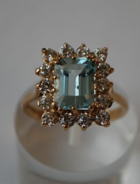 A hallmarked 9ct gold cluster ring set with a sentral emerald cut blue stone surrounded by a white stone halo. Hallmarked Sheffield 2000. Size O.5 . Weight 3.9g.